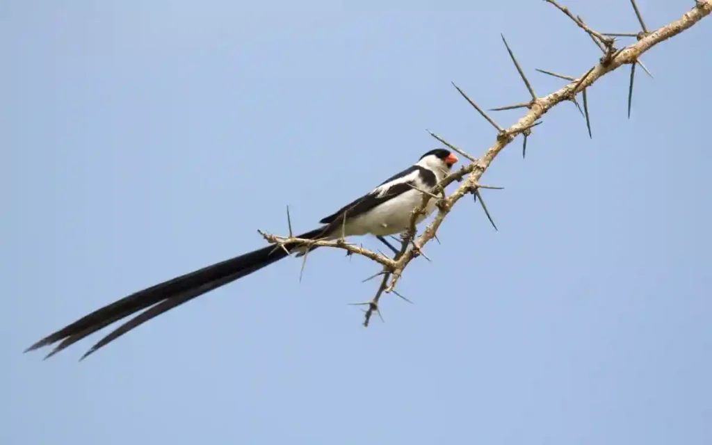 The Pin-tailed Whydah is a small bird with big attitude—especially the males during breeding season. They measure around 12–13 cm, but males grow extravagant tail feathers up to 20 cm long, giving them a dramatic flair.